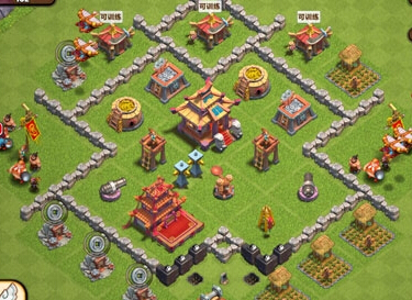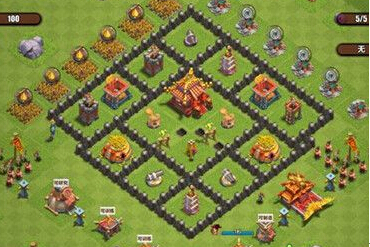 小编这里就推荐以下两个阵型并且做出分析,如下图的阵型是一个典型的九宫阵,防御设施的射程影响着它们在阵中的内外顺序,长射程覆盖短射程,换句话说就是长射程防御要靠近阵的内部,短射程更靠近阵的外部。每个攻击建筑都被包围。防御效果最大化