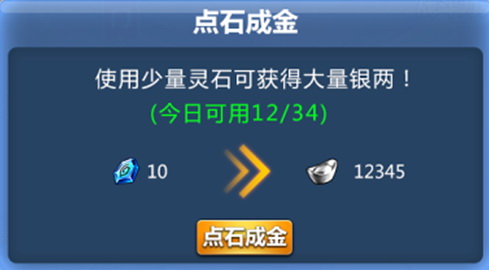 3、点石成金是真正的土豪玩法,但前几次的兑换性价比还是比较高的,如果真缺钱,可以小玩一下,再往后就不要勉强了(土豪们略过此条)。