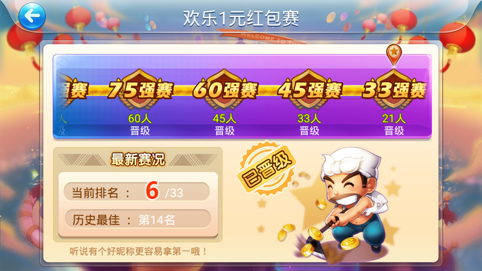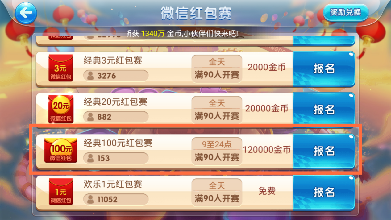 90人的比赛,一般只要打赢6局就可以拿到红包,如果小编打的是100元红包场,说不定就已经拿到小奖金了哦~